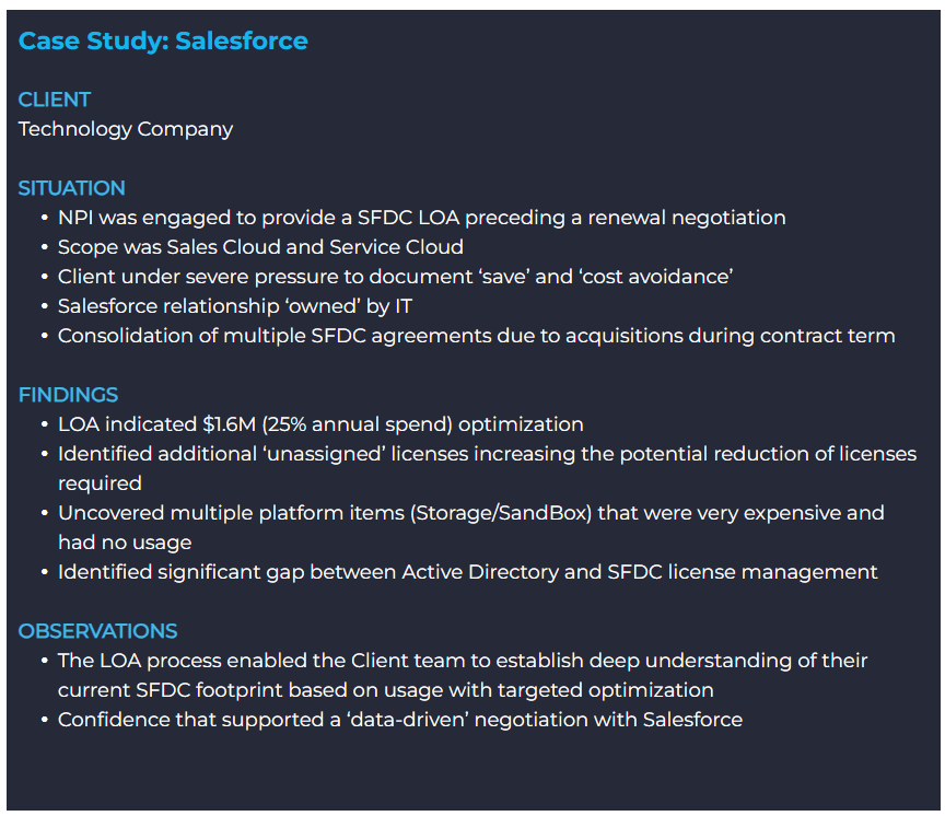 Whitepaper How to Eliminate Toxic Spend on Large SaaS Estates and Reduce SaaS Costs Aug 19, 2021SaaS Management Download the White Paper Download My Copy Share This Article Subscribe For Updates Uncover negotiation leverage and unlock savings across your IT spend. A Guide to Help Enterprise IT Buyers Cut SaaS Spend Waste One challenge enterprise IT buyers face is SaaS spend governance, and that’s evidenced by an increasing rate of wasteful spend on large SaaS estates. This white paper explores the following questions: What makes the SaaS licensing model so difficult to govern? What tactics can I use to optimize SaaS licensing and reduce SaaS costs? What value does SaaS license optimization deliver to the business? How can I prioritize which SaaS estates to optimize and how often? The Relationship Between SaaS, Toxic Spend and IT Procurement While the cloud has made it easier to procure IT, it’s also made it easier to overspend – particularly on SaaS. Enterprise SaaS usage and costs are ballooning and that has revealed vulnerabilities in how enterprises manage these costs. At the root of the problem is toxic spend. Gartner estimates 30 percent of cloud fees paid by organizations are for licenses or subscriptions that are dormant or for features that are not being used1. SaaS cost waste – toxic spend – is a pervasive problem impacting large users of solutions like Salesforce, SuccessFactors, O365, Adobe and Workday, to name just a few. Left unmitigated, SaaS toxic spend will consume funds that would otherwise fuel critical IT initiatives. 1 https://www.gartner.com/en/documents/3894124/software-asset-management-for-the-cloud-consumption-mana Why is SaaS so difficult to govern? Toxic spend is an insidious byproduct of the SaaS licensing model – one that’s deceptively “simple” to consume but difficult to manage. Reasons include: Sourcing often happens in the shadows. SaaS vendors are adept at bypassing IT and procurement and engaging business users directly. License management is inconsistent and distributed. Who owns SaaS license management? In many organizations, the answer isn’t clear. The responsibility is distributed across multiple admins, departments and business units. Those in charge often have varying skill levels and apply standards inconsistently. Independent SaaS management tools are immature. Software asset management tools have been around for a while, but SaaS-specific SAM tools are still nascent and ineffective. While some legacy SAM tools aspire to manage SaaS, few organizations have implemented them deeply enough to be effective. Many SaaS vendors provide their own tools, but those should be approached with caution – outputs are often inaccurate and almost always benefit the vendor. Renewals tend to happen on autopilot. SaaS renewal requirements are rarely validated based on actual usage. Instead, companies simply renew what they have and buy more. This makes it easy for bloat to occur over time – the SaaS estate quietly gets bigger and bigger while costs grow exponentially. Developing a SaaS License Optimization Assessment Strategy To eliminate toxic spend on large SaaS estates and reduce SaaS costs, a thorough assessment of the current state of usage and ownership is required. The objective is to identify licenses that can be terminated or harvested for redeployment (thereby avoiding the purchase of additional licenses to support new users). Assessments should focus on two areas: Rightsizing License AssignmentsAre we using the most cost-effective license type for different user profiles? Enterprise SaaS vendors typically offer a variety of license types with specific features and access rights. To keep things simple, customers will often deploy a standard license type with equal capability for all users – even if certain users don’t need certain capabilities. More often than not, this leads to a default assignment of the most expensive license type. Customers need to perform a deep-dive analysis into actual usage data to understand if there is an opportunity to rightsize licenses for certain users. This information will enable stakeholders to rapidly switch to a more cost-effective assignment of licenses. Liberation of License CurrencyAre there inactive licenses that can be terminated or redeployed? To liberate license currency, enterprises must have visibility into usage data to identify inactive licenses that can be terminated or redeployed. Inactive licenses typically fall into the following categories: No-pulse users consuming valid license (e.g. licenses assigned to IP addresses like printers) Former employees and/or contractors consuming active licenses Inactive users (90 days) consuming valid licenses Users assigned multiple active licenses Disabled users consuming advanced threat protection (Microsoft only) SaaS License Optimization Assessment Checklist to Reduce SaaS Costs SaaS license optimization assessments are one of the most non-disruptive paths to IT cost reduction. They typically identify seven-figure savings (or more) on large software estates. At a granular level, what activities must be performed? 1. Consolidate and Normalize Entitlement and Usage Information What are your license entitlements? Who’s using what and how does that align with your license entitlements? 2. Categorize Users and Develop User Profiles What are the different types of users within your organization? What are the unique user requirements per user type (or category)? 3. Filter and Analyze Usage Are you paying for inactive or improperly assigned licenses across the SaaS estate? Are you paying for premium license types when a more cost-effective license type will satisfy usage requirements? 4. Quantify Optimization Opportunities Based on usage analysis, what opportunity exists for rightsizing license assignments? What opportunity exists for terminating inactive licenses or harvesting them for redeployment? 5. Report Findings and Recommendations, and Est