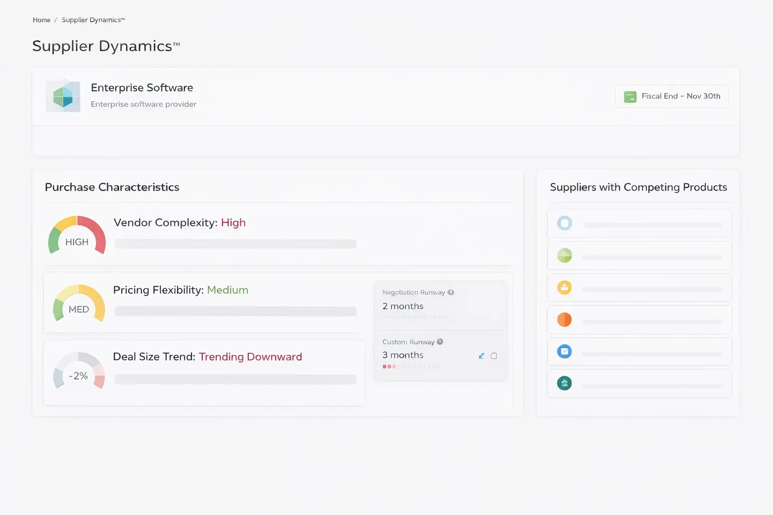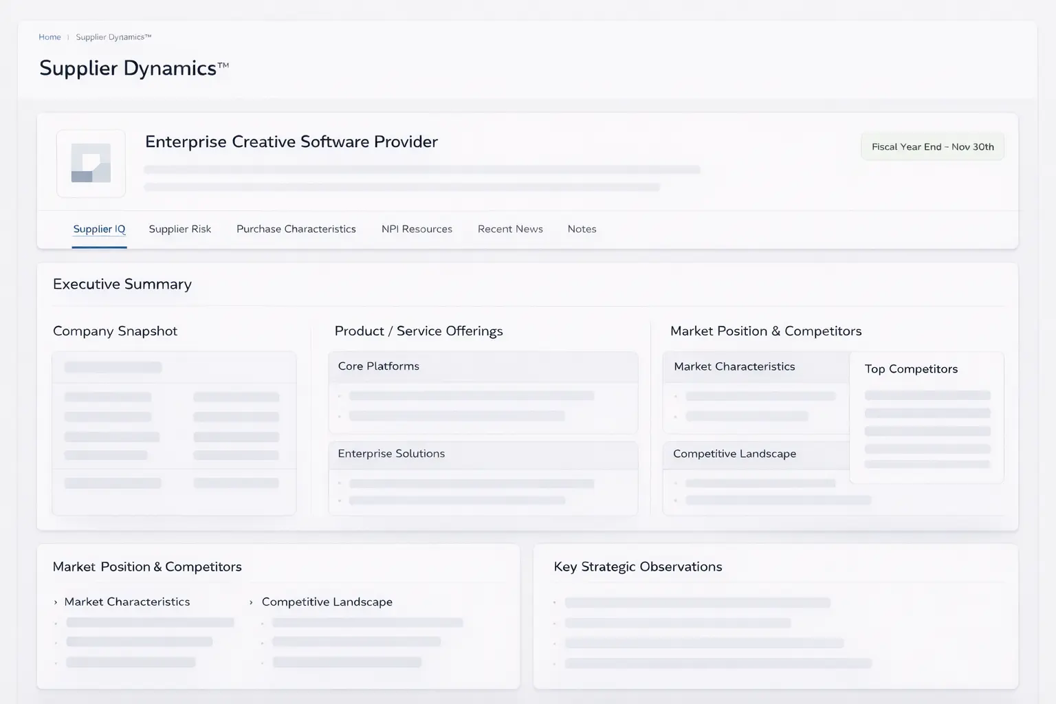 Know what’s happening behind the supplier pitch. We consolidate public signals to surface market dynamics, company shifts, key financial indicators, and negotiation tactics to help you build leverage. Is the supplier gaining momentum or under pressure? Where does that translate into buy-side leverage? What tactics should you use?